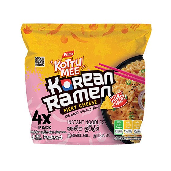 The Prima Kottu Mee Ramen Cheese 4S 465g is a pack of four instant noodle servings that offers a fusion of bold Korean spice and creamy, rich cheese flavor.