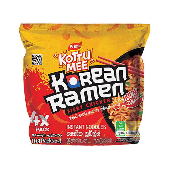 The Prima Kottumee Korean Ramen Fiery Chicken 4 PACK 440g is a convenient pack of four instant noodle servings, each weighing approximately 110g, that delivers an intense and authentic Fiery Chicken Korean-style flavor.