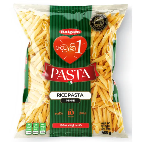The Raigam Dev 1 White Rice Pasta Penne 400g is a gluten-free pasta product made from 100% white rice flour and shaped into the classic penne tubes, providing a healthy and easily digestible alternative to wheat pasta.