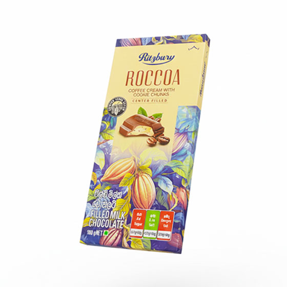 The Ritzbury Roccoa Coffee Cream with Cookie Chunks Filled Milk Chocolate 100g is a center-filled milk chocolate bar that blends rich coffee cream with crunchy cookie pieces.