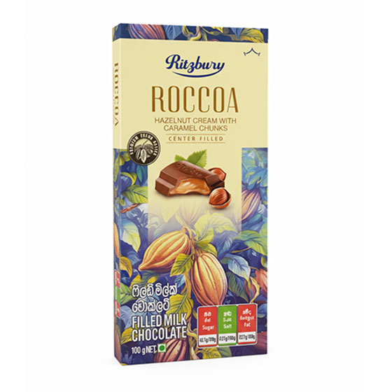 The Ritzbury Roccoa Hazelnut Chocolate 100g is a milk chocolate bar that typically comes as a center-filled variant with hazelnut cream and caramel chunks. It is part of the premium Roccoa range, known for its rich flavor profiles.